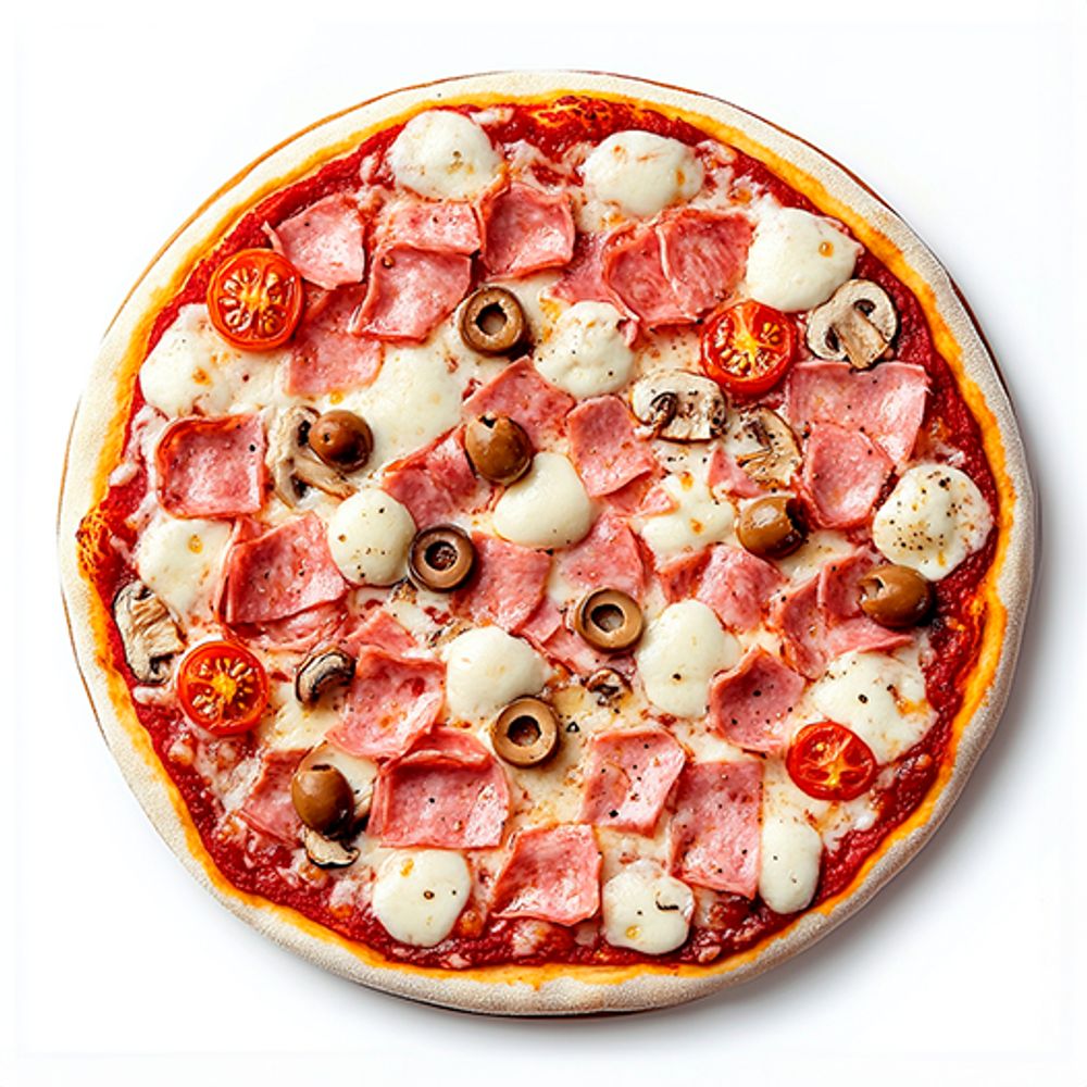 Ветчина, белые грибы, томаты, сыр Моцарелла, маслины, соус красный.