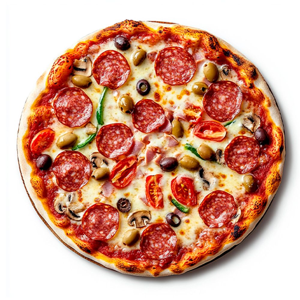 Салями, ветчина, томаты, маслины, перец болгарский, грибы, сыр Моцарелла, соус красный.