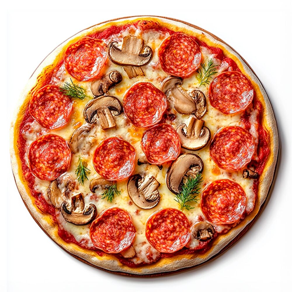 Салями, свежие грибы, томаты, сыр Моцарелла, соусы.