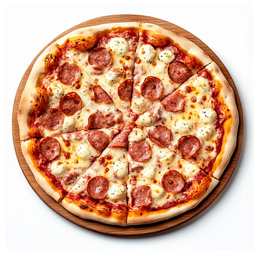 Колбаса халяль, ветчина, сыр Моцарелла, соусы красный и белый.