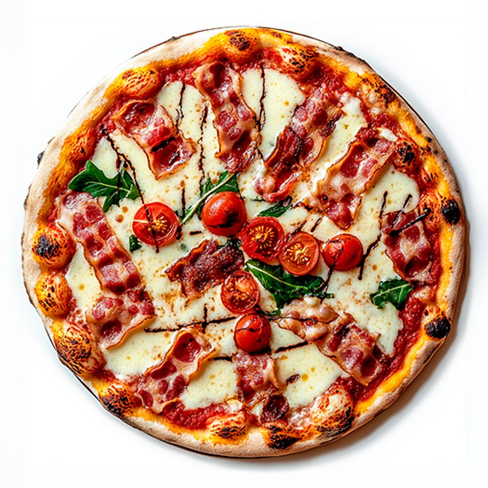 Бекон, томаты, сыр Моцарелла, соус, зелень.