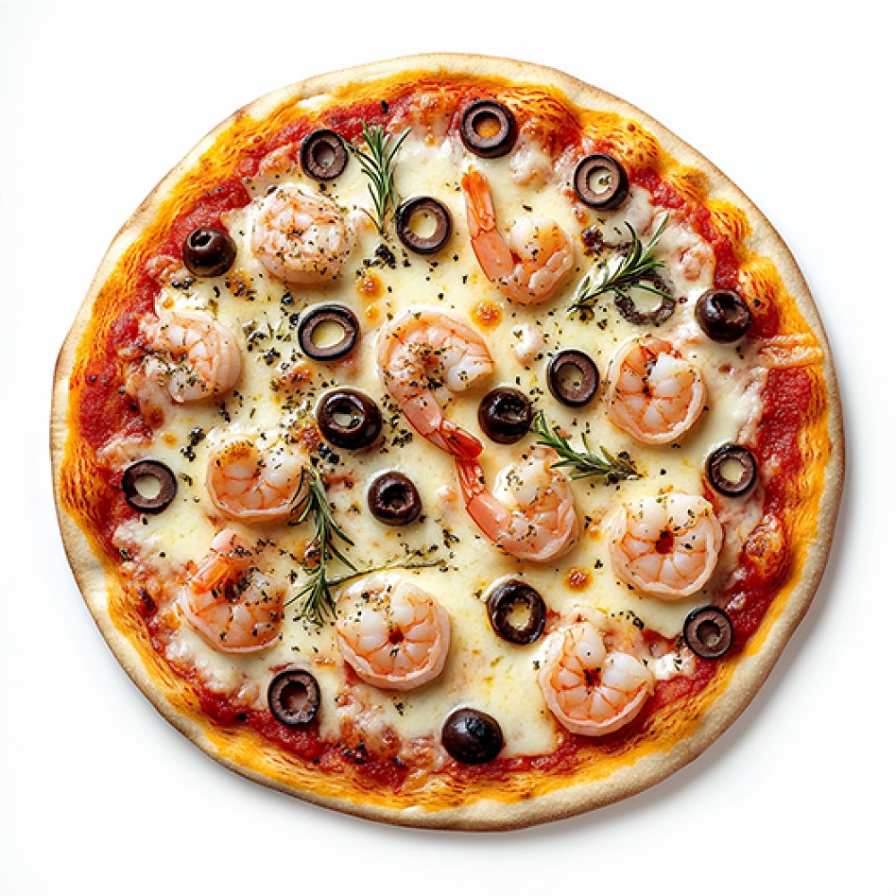 Креветки, томаты, маслины, сыр Моцарелла, красный соус, зелень.