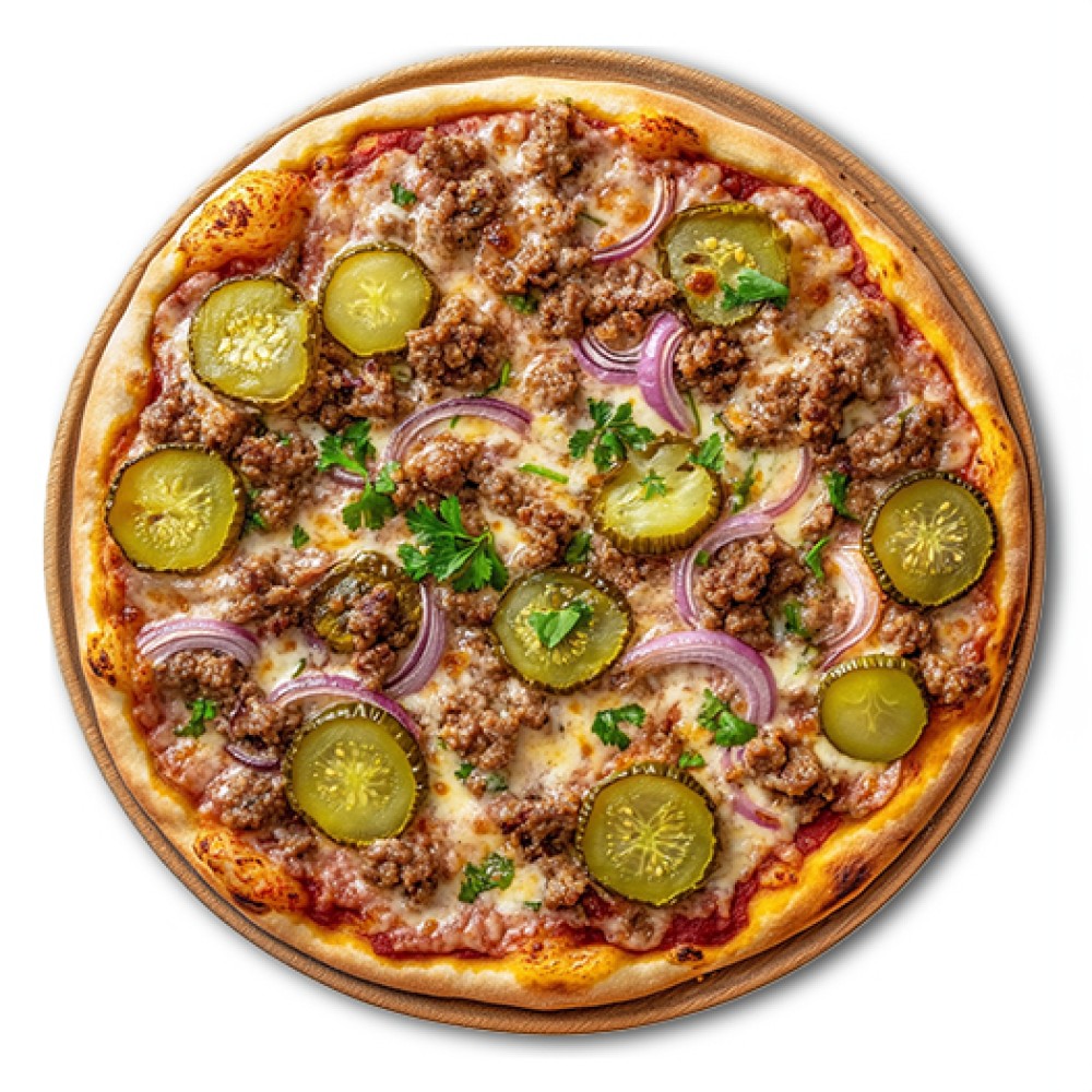 Фарш из мяса телят, маринованные огурчики, сыр моцарелла, красный лук, три соуса: белый, красный и сырный, кунжут.