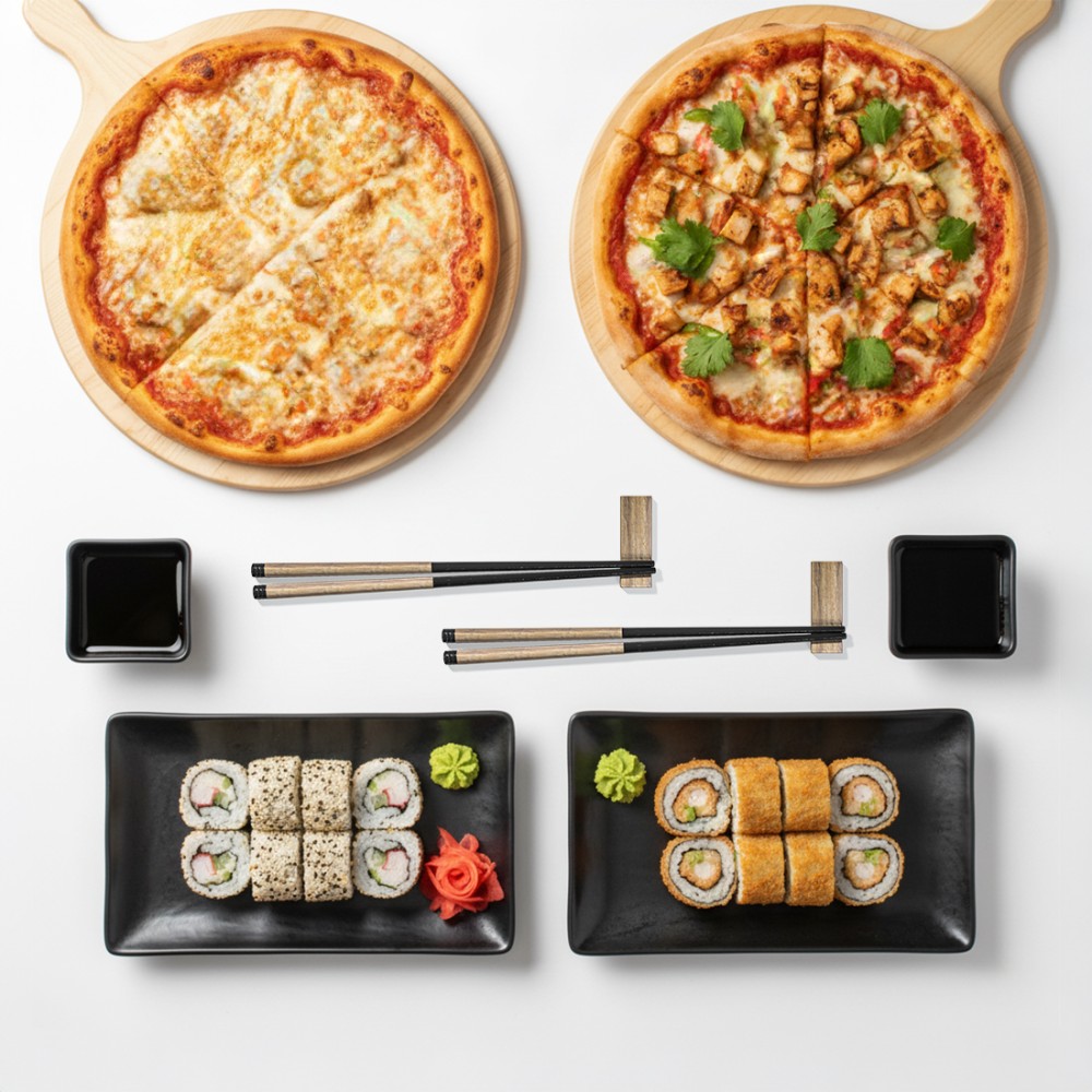 Пиццы 20см: Сырная и Парижанка; Роллы: Цезарь и темпура