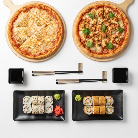 Пиццы 20см: Тоскана и Парижанка; Салаты Цезарь с курицей и Греческий; Два картофеля фри