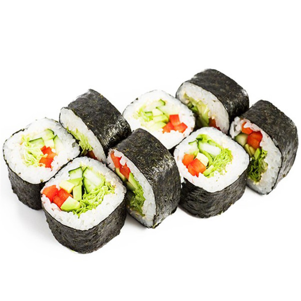 Салат, огурец, паприка, томат, рис, нори, кунжут.