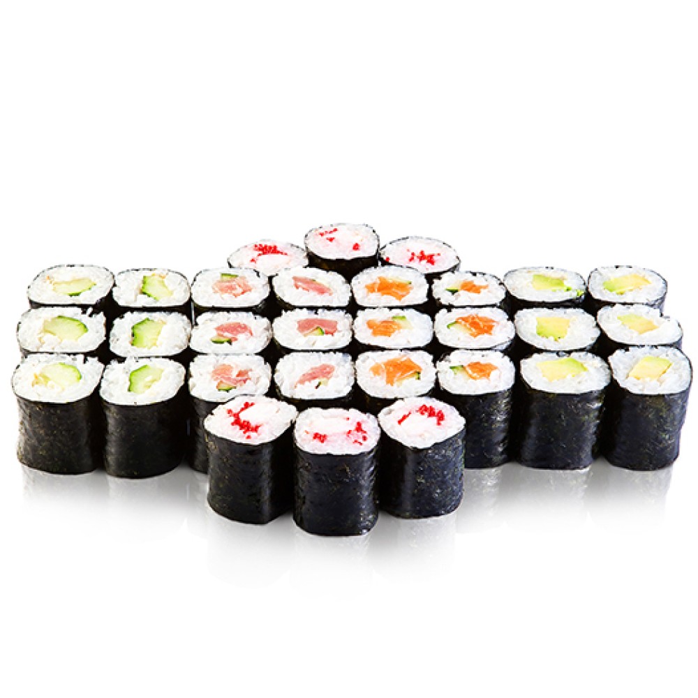 Роллы: Сяке Маки (8шт), Эби Маки (8шт), Капа Маки (8шт), Унаги маки (8шт).